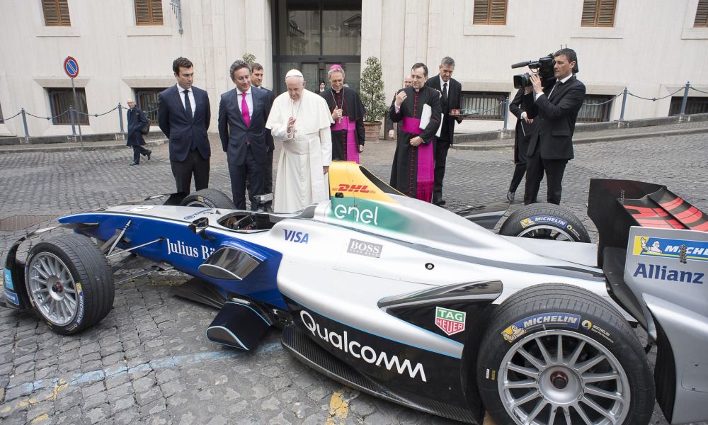 Ο Πάπας Φραγκίσκος ευλόγησε, ένα μονοθέσιο ηλεκτροκίνητο αγωνιστικό, μία Formula E παρουσία δεκάδων ανθρώπων και κάλεσε τους οδηγούς της Formula Ε στην Πόλη...