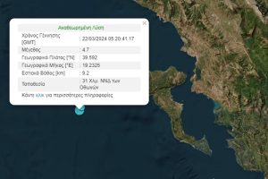 Σεισμική δόνηση 4,7 βαθμών της κλίμακας Ρίχτερ σημειώθηκε στις 7:20 το πρωί νότια της Κέρκυρας με εστιακό βάθος 9,2 χιλιόμετρα.