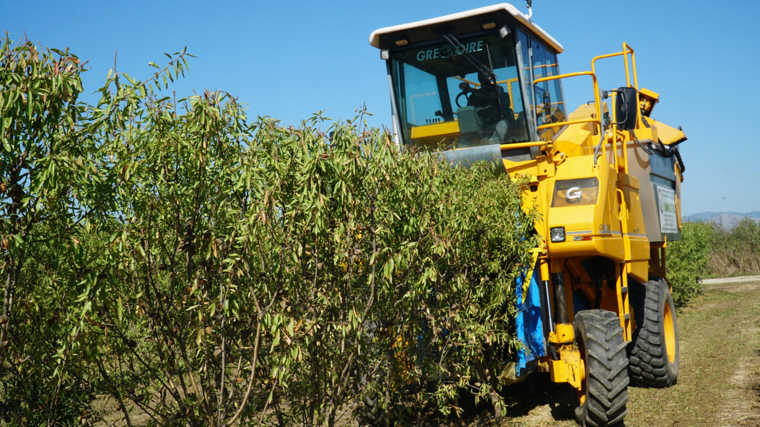 Για τρίτη χρονιά ο Λευτέρης Δαμασιώτης συνεχίζει τη μηχανική συγκομιδή αμυγδάλων από τις καλλιέργειες πυκνής φύτευσης.