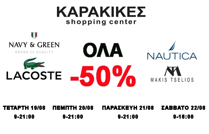 Για 4 μέρες μόνο στον 3 όροφο του Karakikes Shopping Center θα βρείτε 4 από τα αγαπημένα σας #brand στην μισή τιμή (ρούχα και υποδήματα ) ΟΛΑ -50%...
