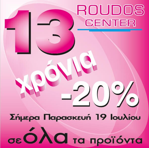 Μόνο για σήμερα Παρασκευή στα ROUDOS CENTER και ROUDOS κομμωτήριο θα έχετε έκπτωση -20% σε όλα τα είδη και τις υπηρεσίες μας.