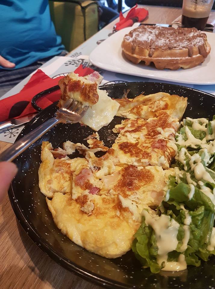 Σπάμε τα αυγά και τα ρίχνουμε στο τηγάνι … αλάτι, πιπέρι, γάλα και αλλαντικά που διαλέξαμε απ’ τον κατάλογο ….