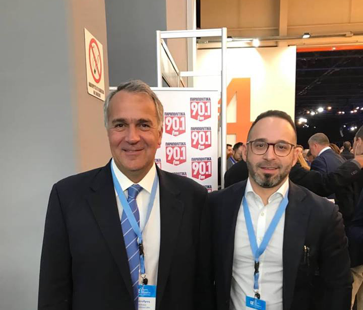 Θερμός εναγκαλισμός του προέδρου της Ν.Δ. με τον πρόεδρο της ΕΑΣ Τρικάλων κατά την είσοδό του στο χώρο που διεξάγεται το Συνέδριο του κόμματος.