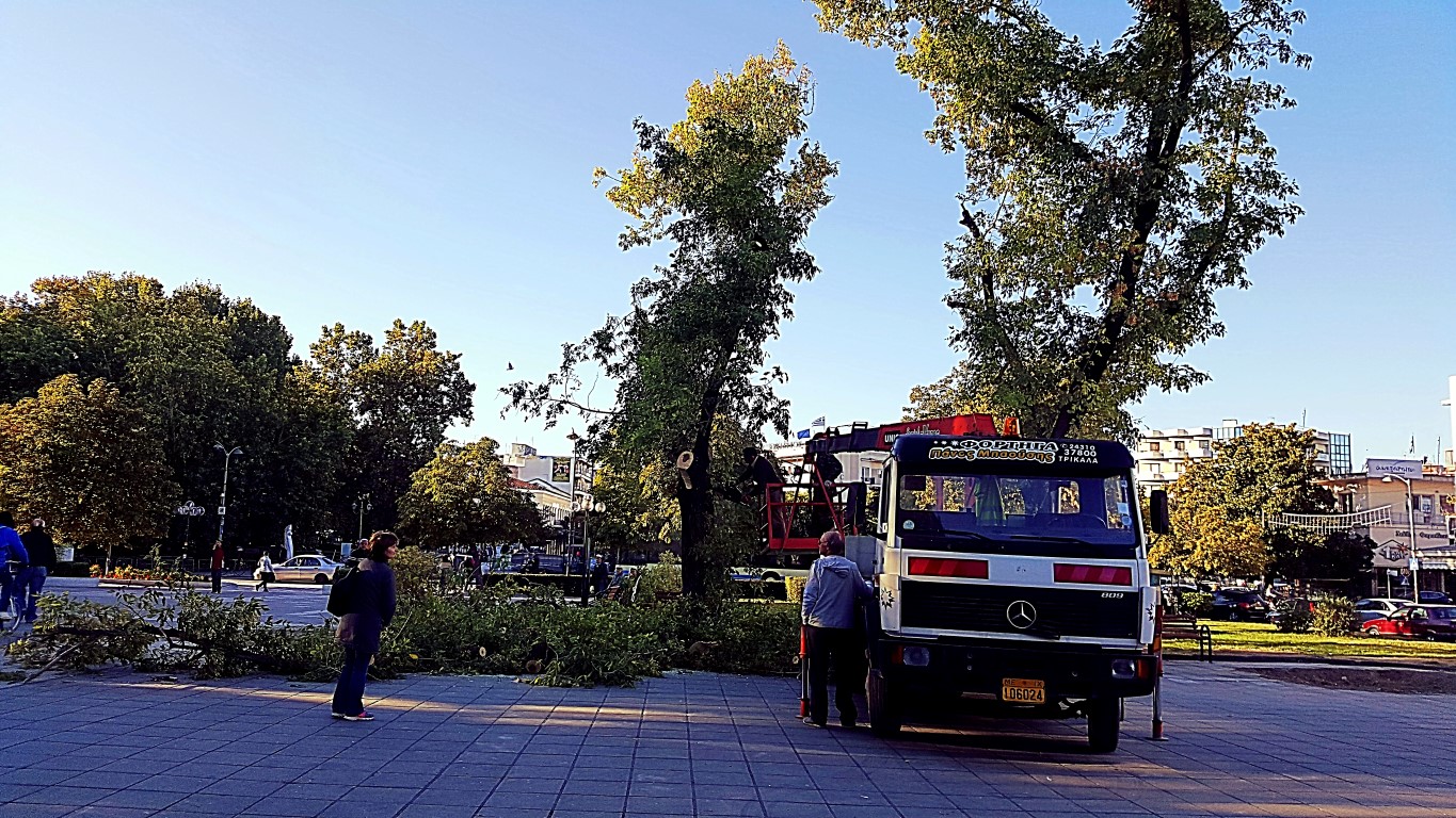 Συνεχίζεται η κοπή των δέντρων στην κεντρική πλατεία των Τρικάλων, στο πλαίσιο της ομόφωνης απόφασης του Δ.Σ. Τρικκαίων, λόγω φόβου για πτώση αυτών.