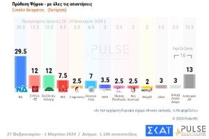 Πτώση μίας μονάδας για τη Νέα Δημοκρατία και οριακές αυξομειώσεις στα ποσοστά του ΣΥΡΙΖΑ και του ΠΑΣΟΚ, προκύπτουν στην τελευταία δημοσκόπηση της Pulse, που...