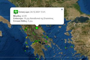 Σεισμική δόνηση μεσαίου μεγέθους, 4 Ρίχτερ σημειώθηκε νωρίς το μεσημέρι της παραμονής των Χριστουγέννων με επίκεντρο την περιοχή της Ελασσόνας.