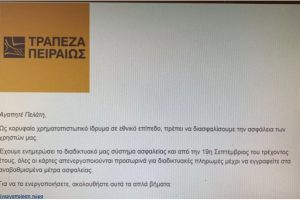 Δεκάδες πολίτες έλαβαν τη Δευτέρα πλαστογραφημένα email, δήθεν της Τράπεζας Πειραιώς που τους καλεί να κάνουν κλικ σε συγκεκριμένο σύνδεσμο-παγίδα.