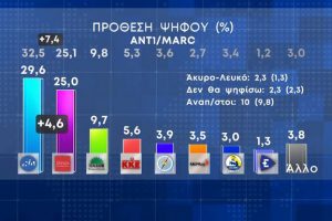 Διαφορά 7,5 μονάδων μεταξύ Νέας Δημοκρατίας και ΣΥΡΙΖΑ-ΠΣ καταγράφει νέα δημοσκόπηση της Marc για λογαριασμό του Ant1.