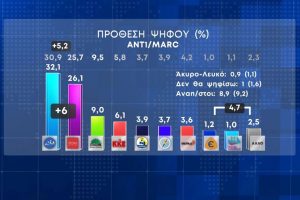 Στις 6 μονάδες διαμορφώνεται η διαφορά μεταξύ ΝΔ και ΣΥΡΙΖΑ σύμφωνα με νέα δημοσκόπηση της Marc που παρουσιάστηκε στο κεντρικό δελτίο ειδήσεων του ANT1.