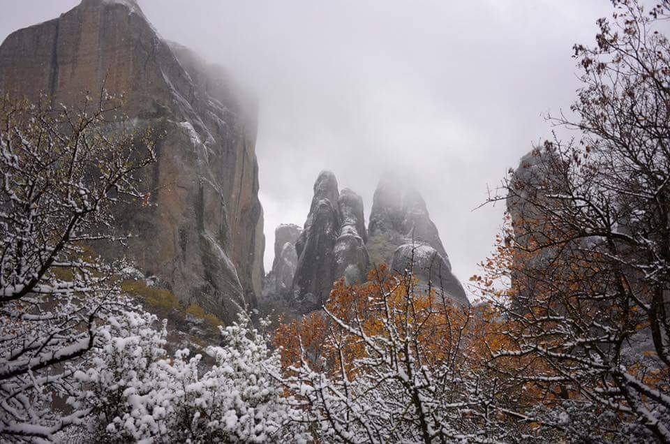 Σε όλο και χαμηλότερο υψόμετρο εκδηλώνονται χιονοπτώσεις στο ν. Τρικάλων και από το απόγευμα της Τρίτης χιονίζει και στα Μετέωρα.