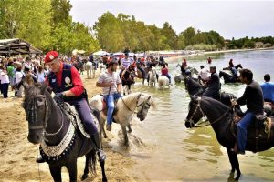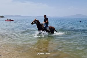 Μεγάλες στιγμές το μεσημέρι της Πέμπτης, γιορτή της Αναλήψεως, στα Καλά Νερά Βόλου, εκεί όπου κατά την παράδοση τέτοια μέρα αγιάζουν τα άλογα μέσα στη θάλασσα.