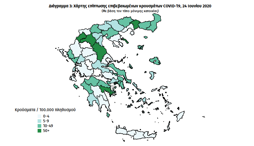 Νέο, επικαιροποιημένο, χάρτη με τα κρούσματα στη χώρα μας έδωσε χθες ο ΕΟΔΥ.