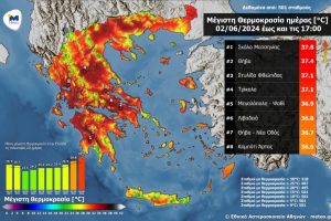 Υψηλές θερμοκρασίες σημειώθηκαν στο μεγαλύτερο μέρος της χώρας μας την Κυριακή 02/06, όπως ευδιάκριτα παρουσιάζεται στη χρωματική κλίμακα θερμοκρασιών του...