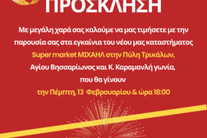 Το απόγευμα της ερχόμενης Πέμπτης 13 Φεβρουαρίου στις 6 μ.μ. εγκαινιάζεται το νέο σούπερ μάρκετ ΜΙΧΑΗΛ στην Πύλη (Αγίου Βησσαρίωνος και Κ. Καραμανλή, γωνία).